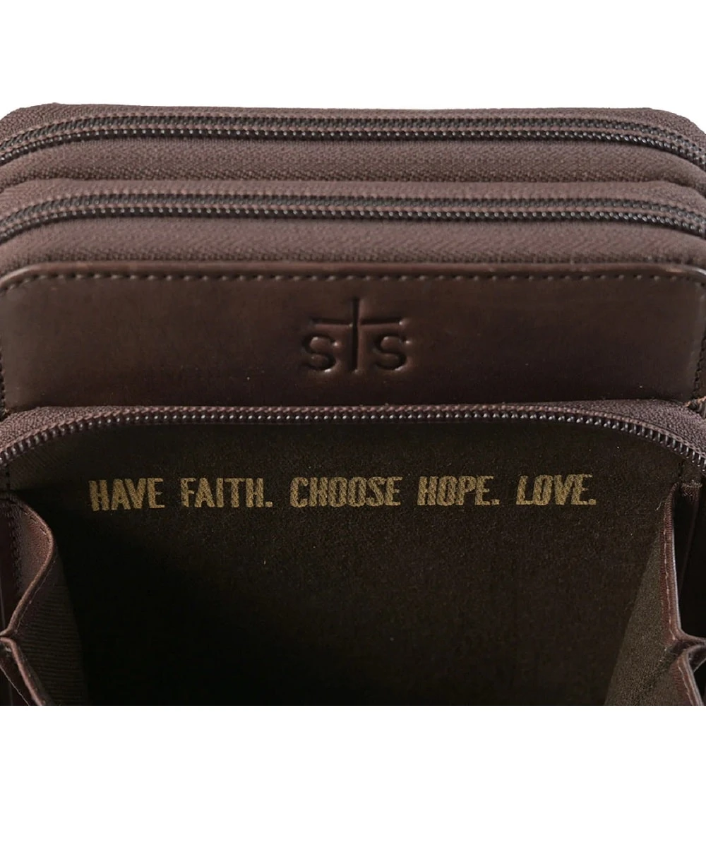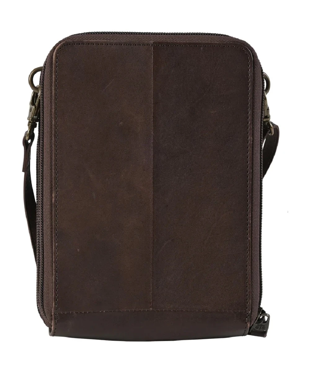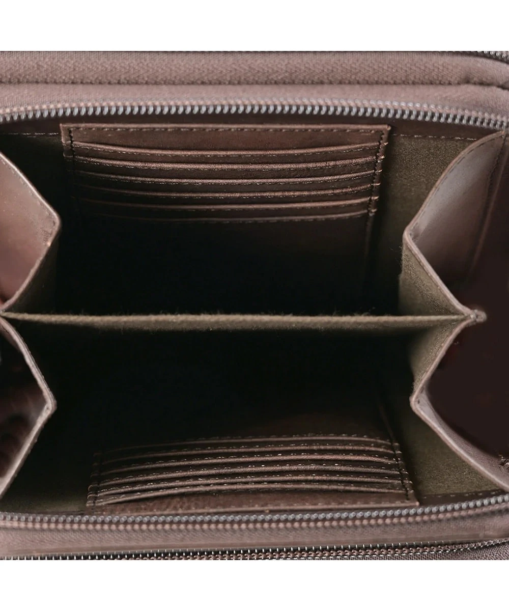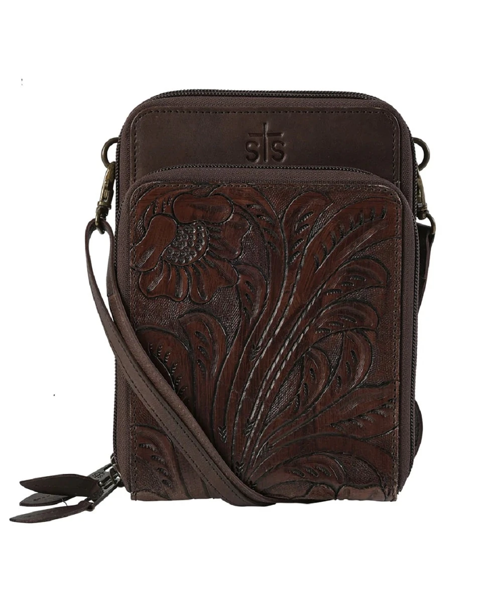 Genuine Full Grain Leather; Measures Approximately 5.5″ W X 8″ H; Floral Tooled Leather Accents; One Small Zip Closure Compartment On Front; Two Large Zip Closure Compartments On Back; 12 Card Slots; Adjustable And Removable Leather Crossbody Strap; Style #STS31269