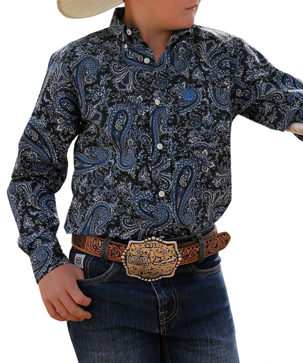 100% Cotton; Long Sleeve; Button Down Collar, Placket, And Cuffs; Single Open Chest Pocket With Logo Embroidery; Straight Back Yoke With Pleat; Color: Navy Paisley Print; Style #MTW7060305