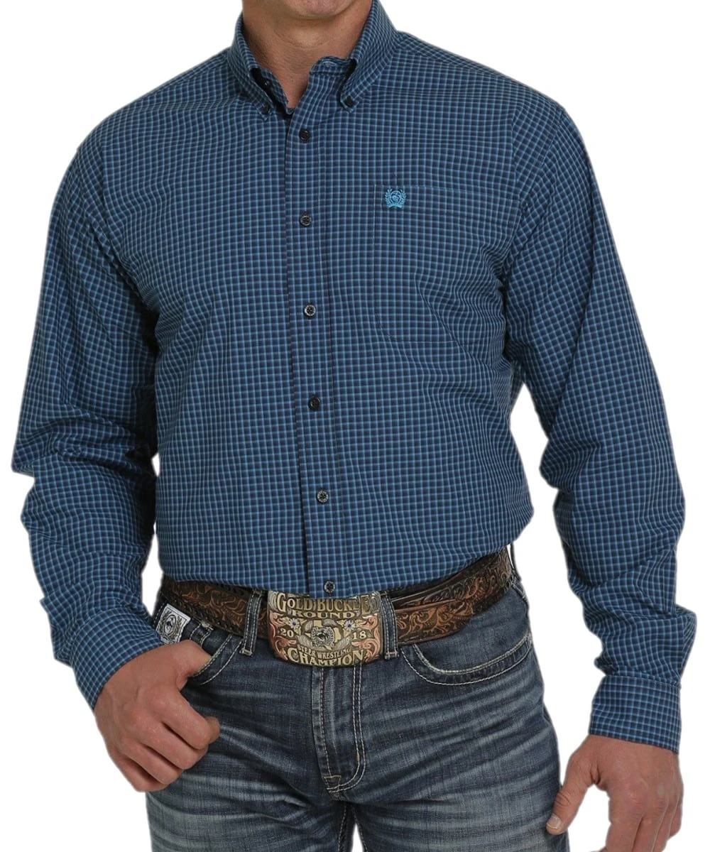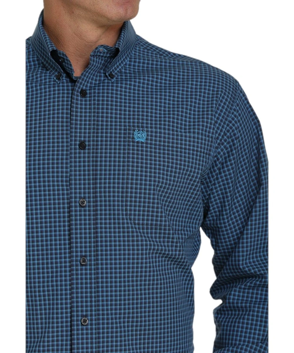 Printed Cotton Plain Weave; Classic Fit; Long Sleeve; Button Down Collar, Placket, And Cuffs; Navy Buttons; Single Open Chest Pocket With Logo Embroidery; Color: Navy/Turquoise Allover Plaid; Style #MTW1105439