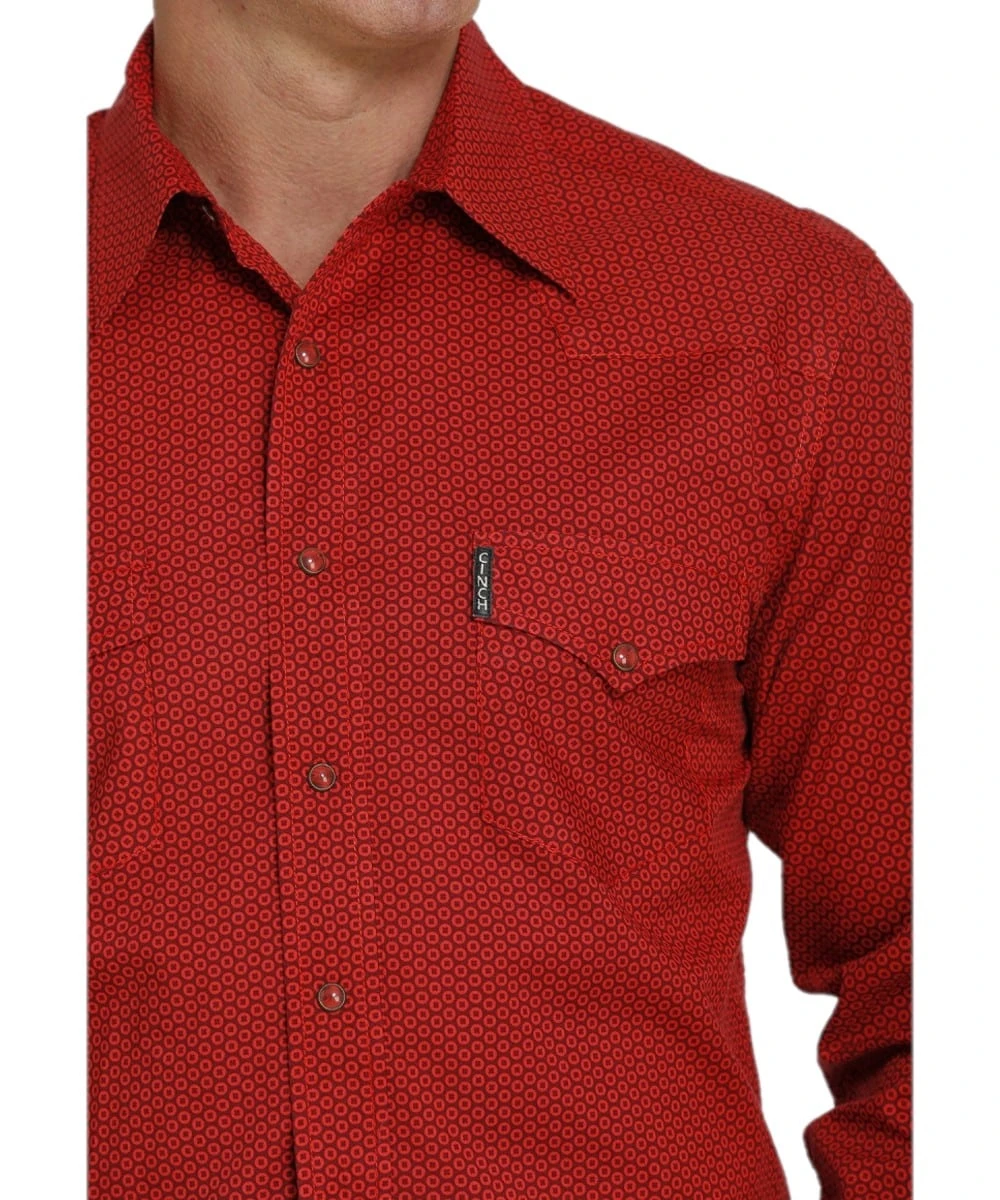Printed Cotton Plain Weave; Modern Fit; Long Sleeve; Spread Collar; Full Front Snap Closure; Red Tortoise Shell Snaps; Dual Single Point Snap Flap Chest Pockets With Logo Label; Two Single Point Front Yokes; Two-Snap Adjustable Cuffs; Single Point Back Yoke; Color: Red With Burgundy Geo Print; Style #MTW1303060