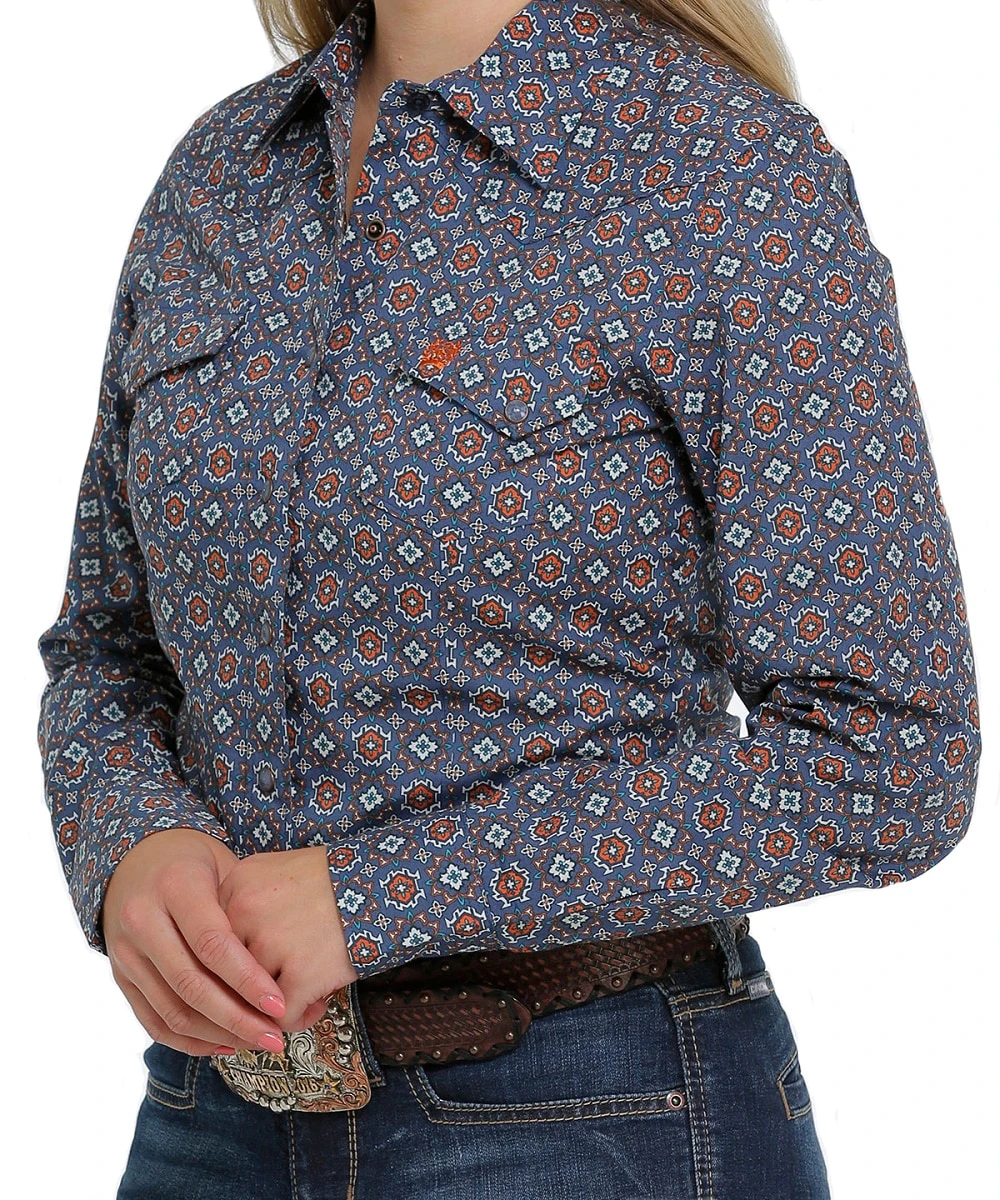 100% Cotton; Long Sleeve; Spread Collar; Blue Snap Closures; Snap Front And Cuffs; Two Snap Flap Chest Pocket; Single Point Front Yoke; Purple, Orange And Teal Medallion Print; Color: Blue; Style #MSW9201035