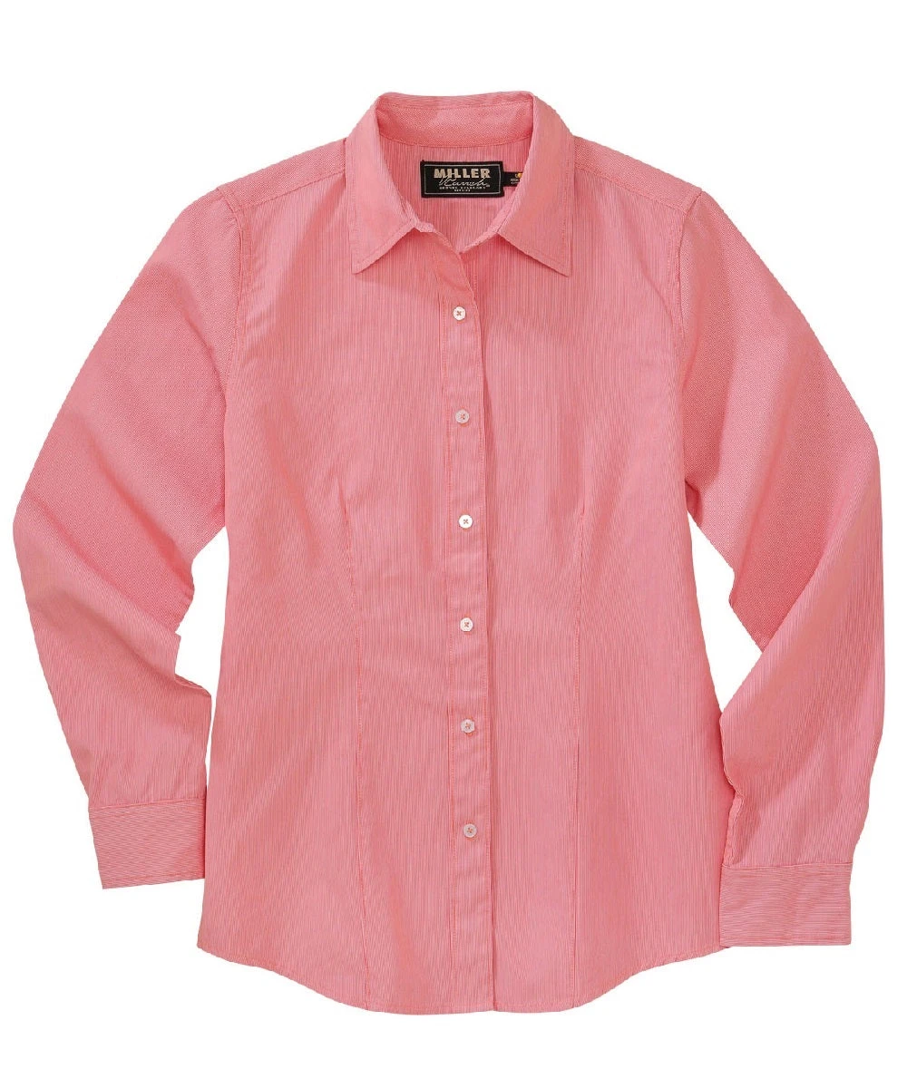 Pinpoint Cotton; Color: Coral; Button Down; Open Collar; Miller Ranch Custom Logo Buttons; Pleated Front; Single Point Back Yoke; Two Button Cuff; White Embroidered Miller Ranch Logo On Left Cuff; Offers Lightweight Strength And Comfort; Style #DSW4200007