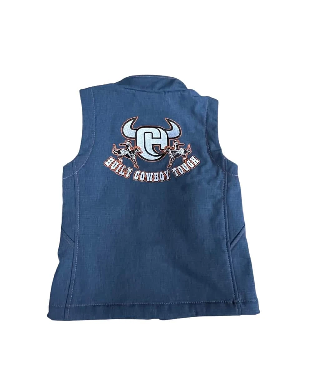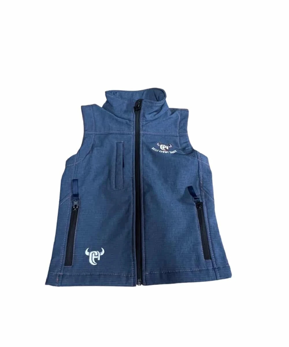 96% Polyester/6% Spandex; Zip Up Collar; Two Zip Hand Pockets; Single Vertical Zip Chest Pocket; Two Internal Open Pockets; Embroidered cowboy Hardware Logo On Front Chest and Back Center; Logo Zipper Pull; Orange Accent Stitching; Color: Harbor Blue; Style #387142-430-K