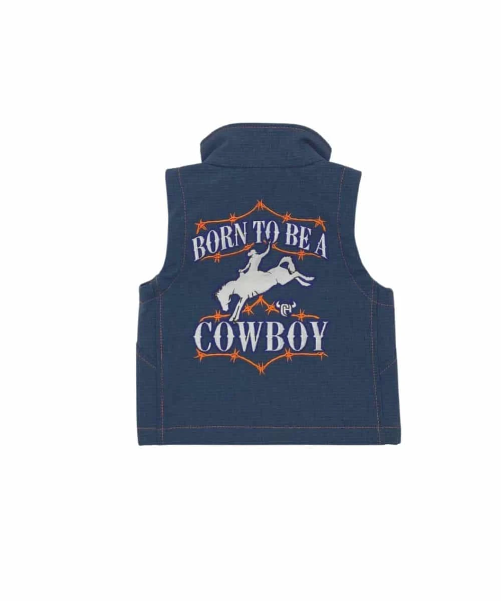94% Polyester/6% Spandex; Polyshell Vest; Zipper Cover On The Top Of The Vest; Neon Orange Zippers; Pocket Zippers Have Navy Fabric Attachments; Main Zipper Has The CH Logo; CH Logo On The Bottom Right; “Born To Be A Cowboy” With Cowboy On Bucking Horse On Left Chest; Enlarged Design On The Back; Designs Are Outlined With Blue Stitching; Color: Harbor Blue With Contrast Orange Stitching; Style #787150-430-I5
