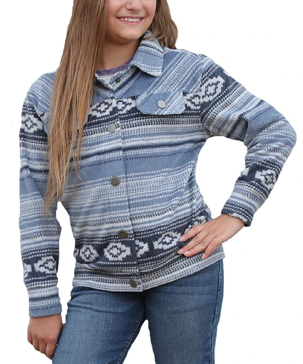 Printed Polyester; Fleece; Spread Collar; Snap Front; Two Snap Flap Chest Pockets; Straight Front Yoke; Blue, White And Light Blue Aztec Print; Style #CWJ8690001
