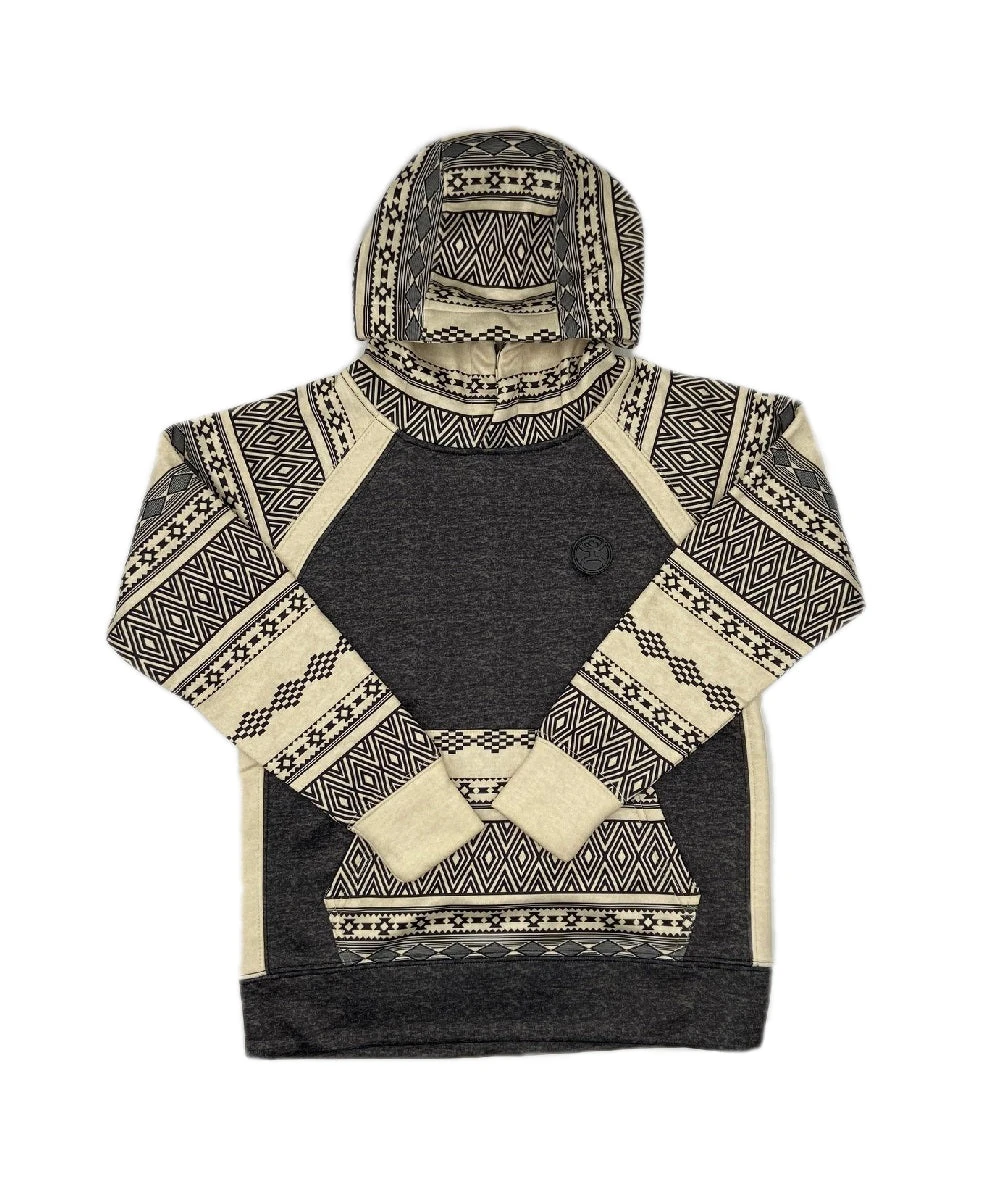 100% Polyester; Signature Soft Feel; Double Lined Hood; Reinforced Cuffs And Waist Band; Strengthened Kangaroo Pocket; Standard Fit;Â Color: Heather Black Body/Cream With Southwest Print Hood, Sleeves And Kangaroo Pocket; Rubber Hooey Logo Patch On Chest; Style #HH1171BKCR-Y