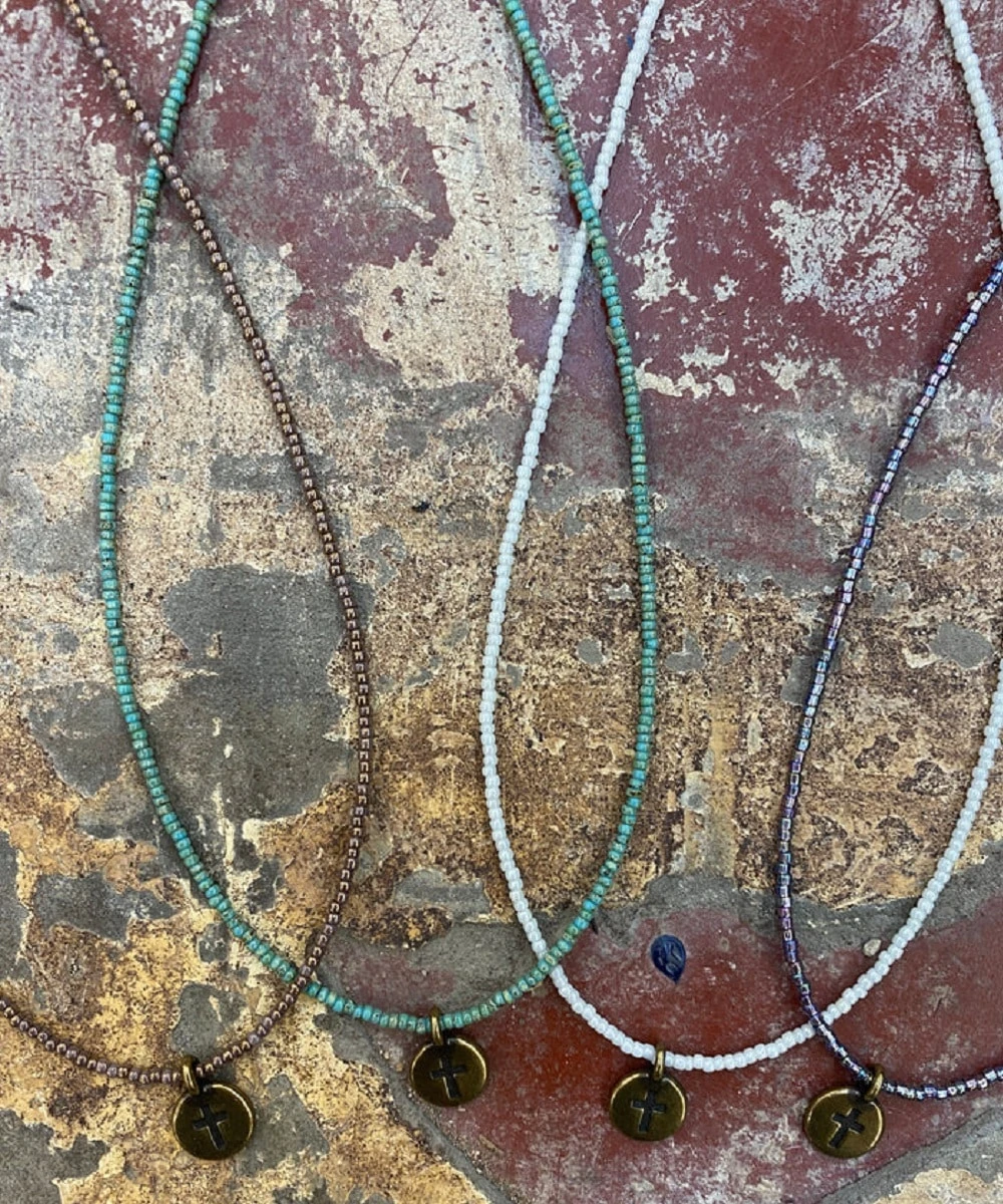 16″; Small Beads; Small Bronze Cross Pendant; Bronze Lobster Claw Clasp; Color Options: Mauve, Turquoise And Pearl; Style #17238