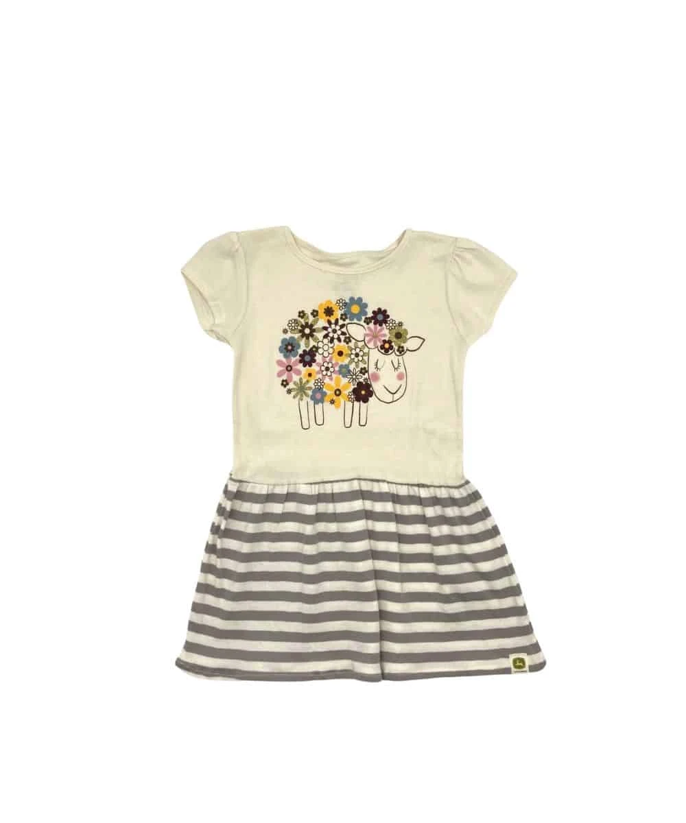 100% Cotton; Color: Ivory; Cap Sleeves; Gray Stripes On Skirt; Design Has A Sheep With Floral Wool; Style #D63238512