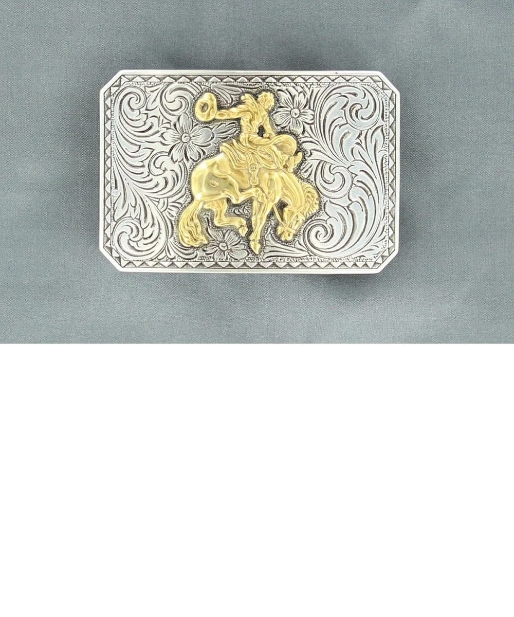 Silver Rectangle; Floral Scroll Engraving; Gold Bucking Bronc And Rider; Triangle Edge; 2″ x 3″; Style #37558