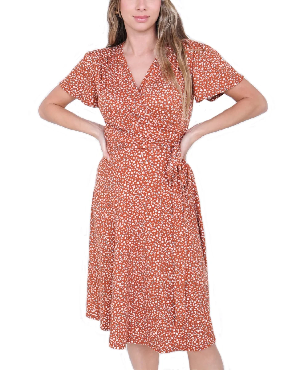 95% Polyester/5% Spandex; Short Sleeves; V Neck; Front Tie; Knee Length; White Floral Print; Color: Orange Rust; Style #MK25834