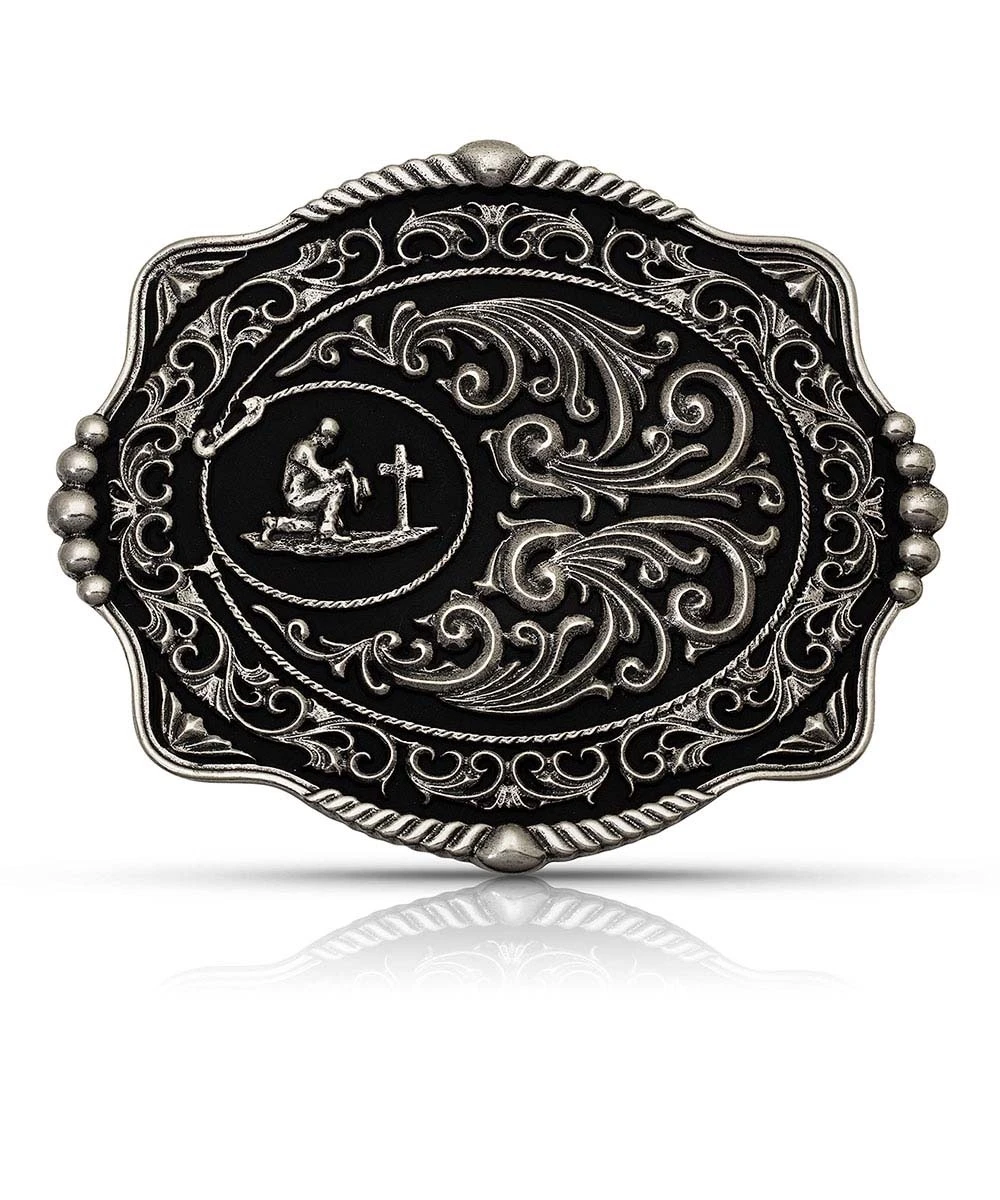 Antiqued Silver Tone Cast; Scalloped Shaped Buckle; Small Antiqued Silver Tone Praying Cowboy Figure Against Darkened Background In Center; Silver Tone Filigree Surrounds It; 1 1/2″ Belt Swivel; Measures Approximately: 4.2″ W X 3.4″ H X .87″ L; Style #A836S