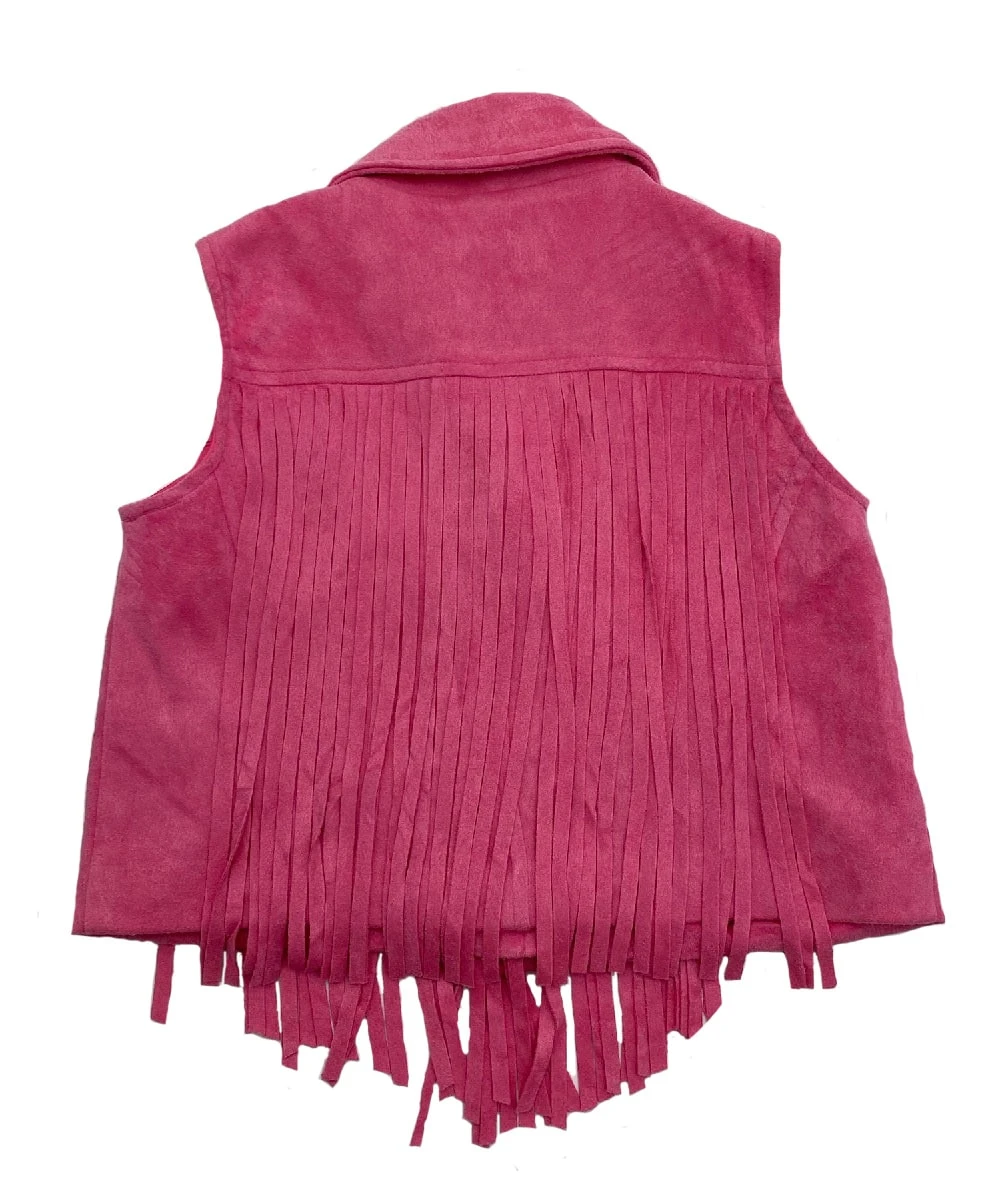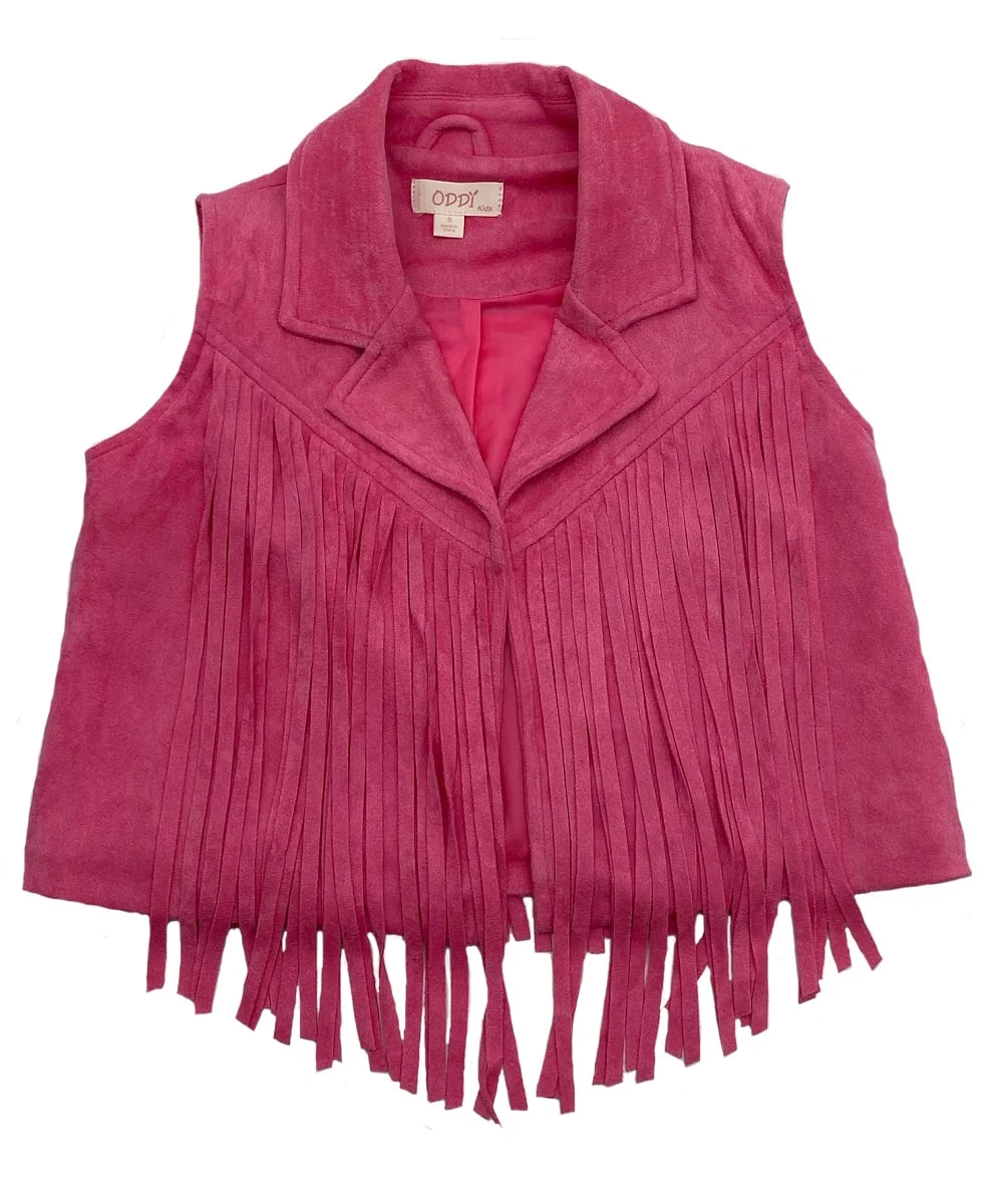 92% Polyester; 8% Spandex; Faux Suede; Cropped; Fringe Along Front And Back; Color: Bubble Gum Pink; Style #IJ14949K