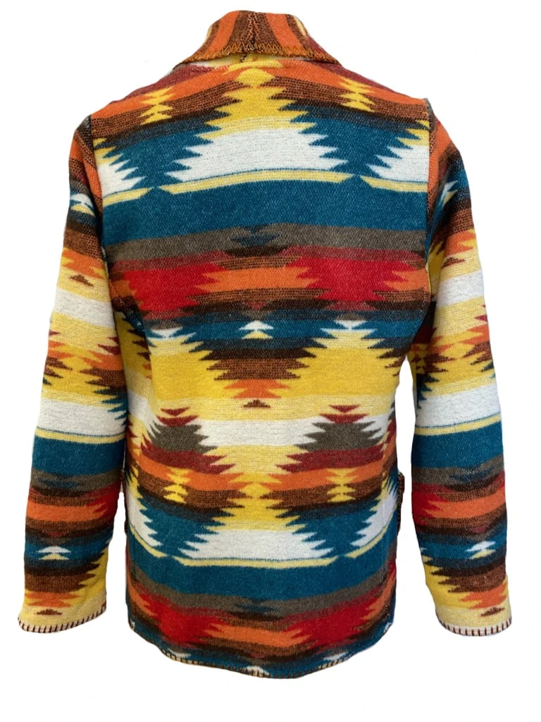 20% Wool/50% Acrylic/25% Polyester/5% O.F.; Unlined; Single Silver Concho Button Closure At Waist; Two Open Hand Pockets; Blanketstitch Trim Edges; Teal, Red, Orange And Yellow Aztec Print; Color: Sunny Daze; Style #877SD