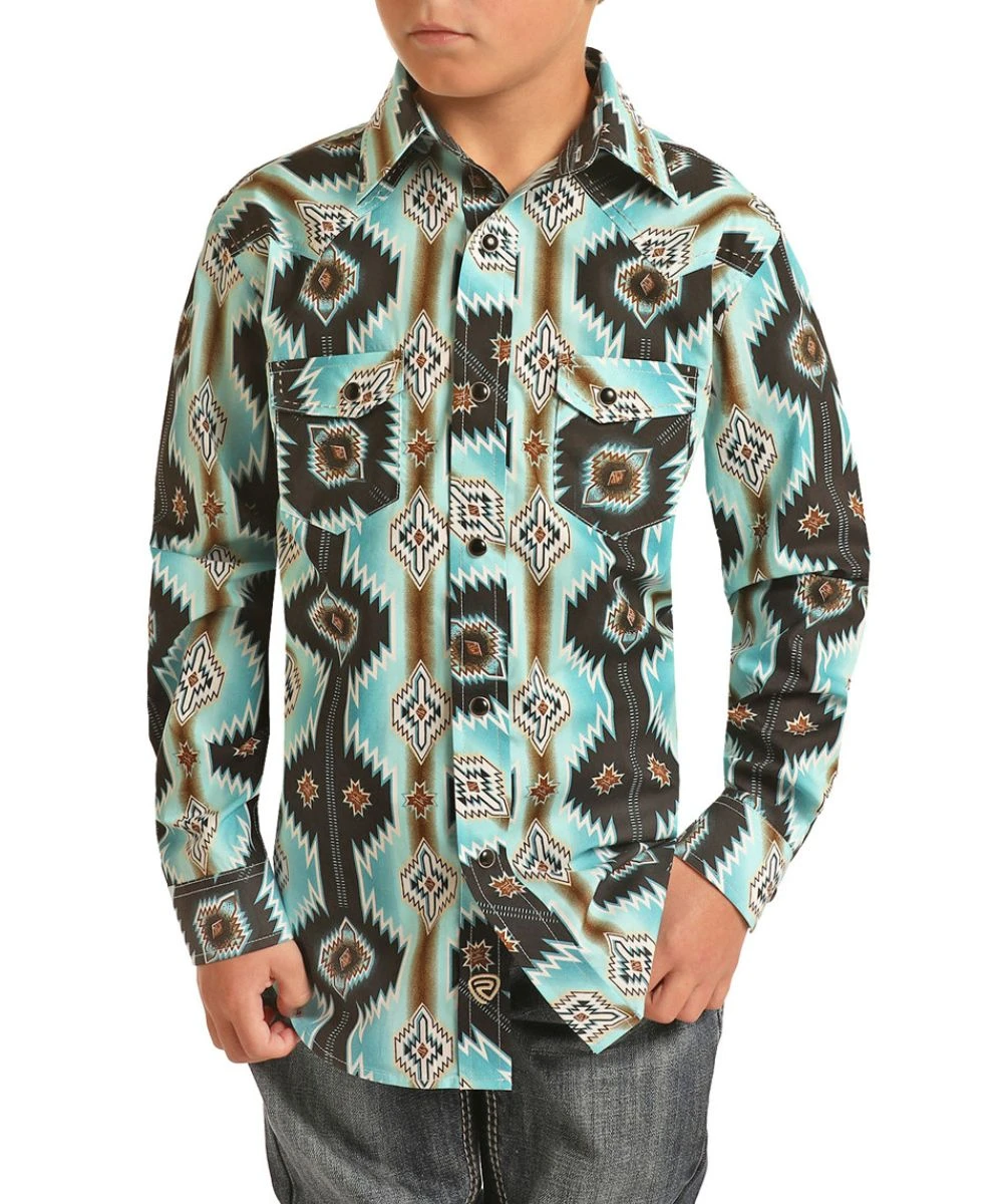 100% Cotton; Long Sleeve; Spread Collar; Snap Front Placket And Cuffs; Dual Single Point Snap Flap Chest Pockets; Single Point Front And Back Yokes; Color: Aqua Aztec Print; Style #B8S3332