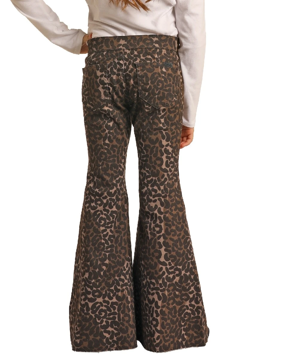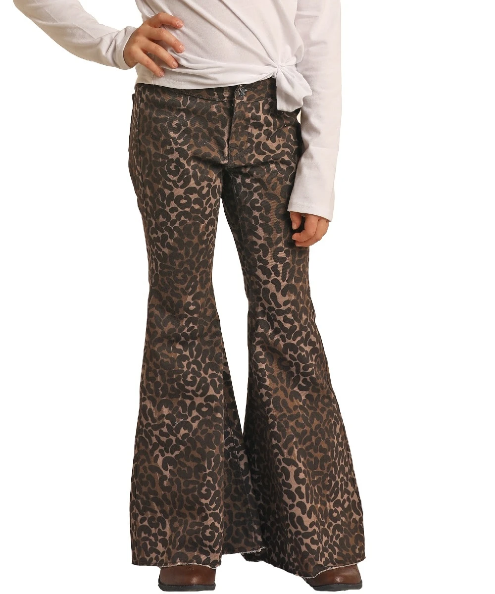 97% Cotton/3% Spandex; Mid Rise; Adjustable Waist; Two Back Pockets; Zip Fly; Raw Edge Bell Bottom Leg; Color: Brown, Black And Beige Cheetah Print; Style #RRGD7PR0FG
