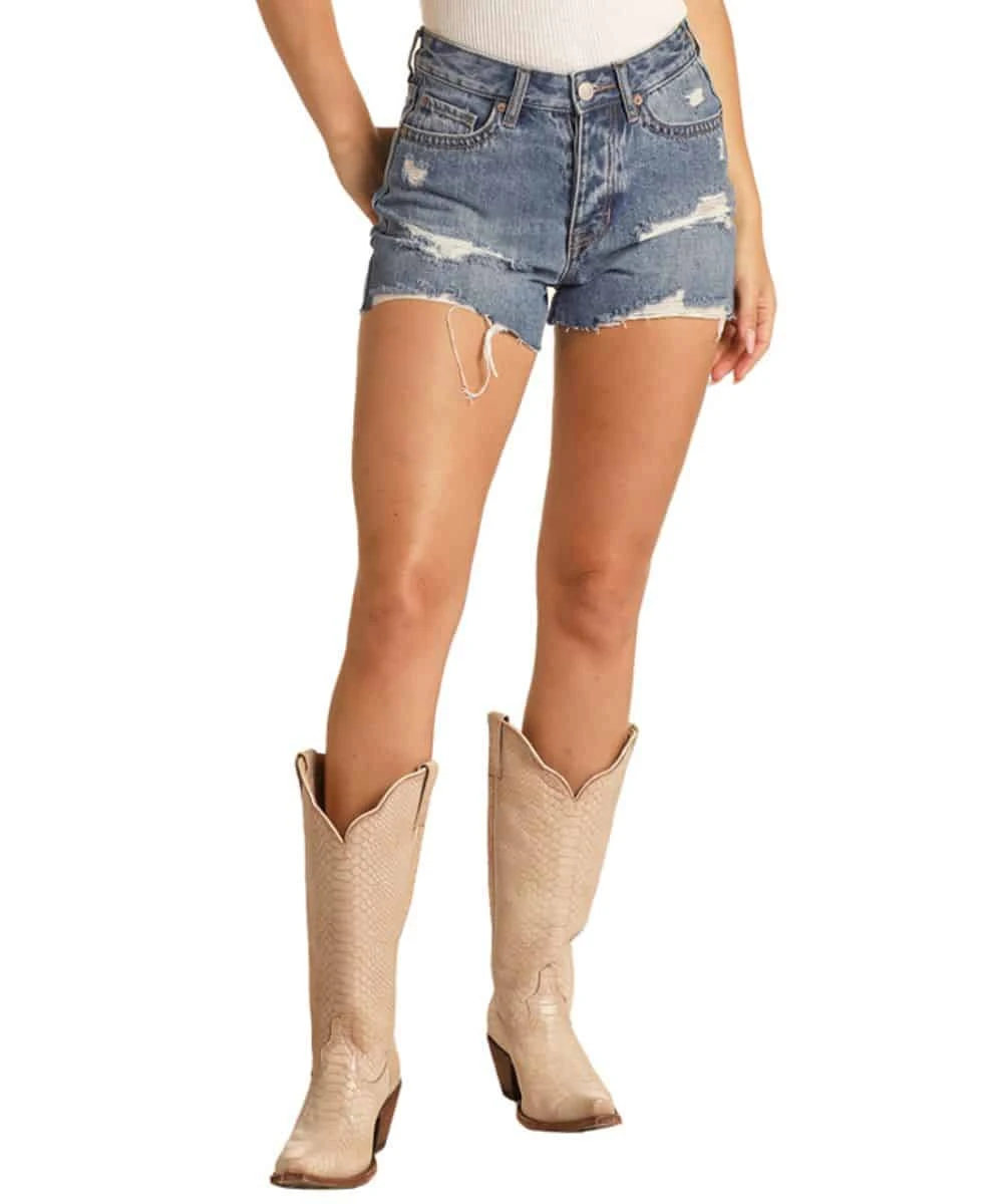 100% Cotton; Non-Stretch; Mid Rise; Zip Fly With Button Closure; Five Pocket Styling; Distressed Front And Back; Raw Hem; Medium Wash; Style #RRWD68R0VB