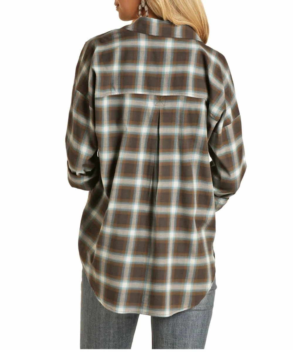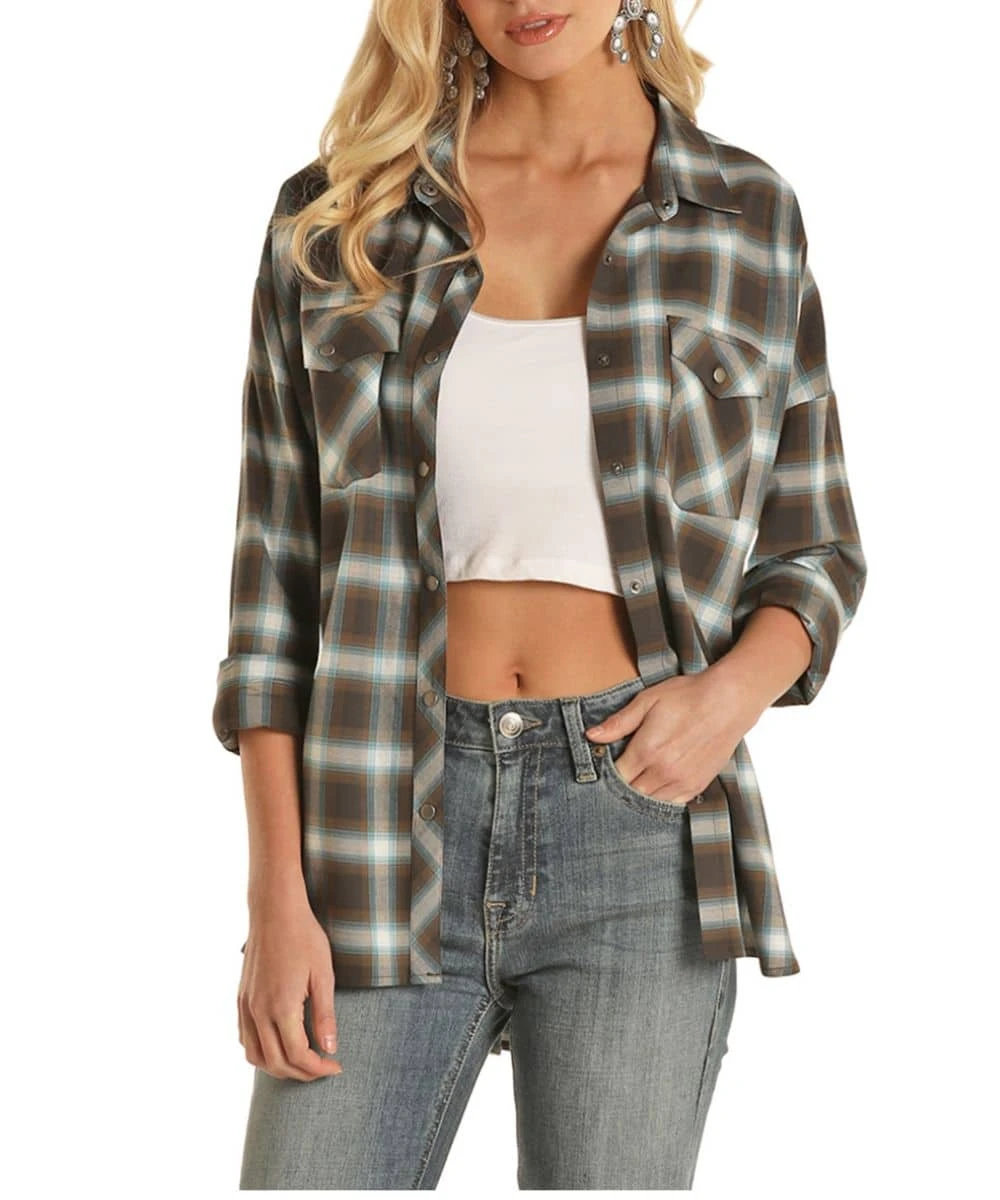 55% Cotton/45% Polyester; Boyfriend Fit; Long Sleeve; Spread Collar; Snap Front Placket And Cuffs; Dual Single Point Snap Flap Chest Pockets; Straight Back Yoke; Color: Brown Plaid; Style #B4S2015