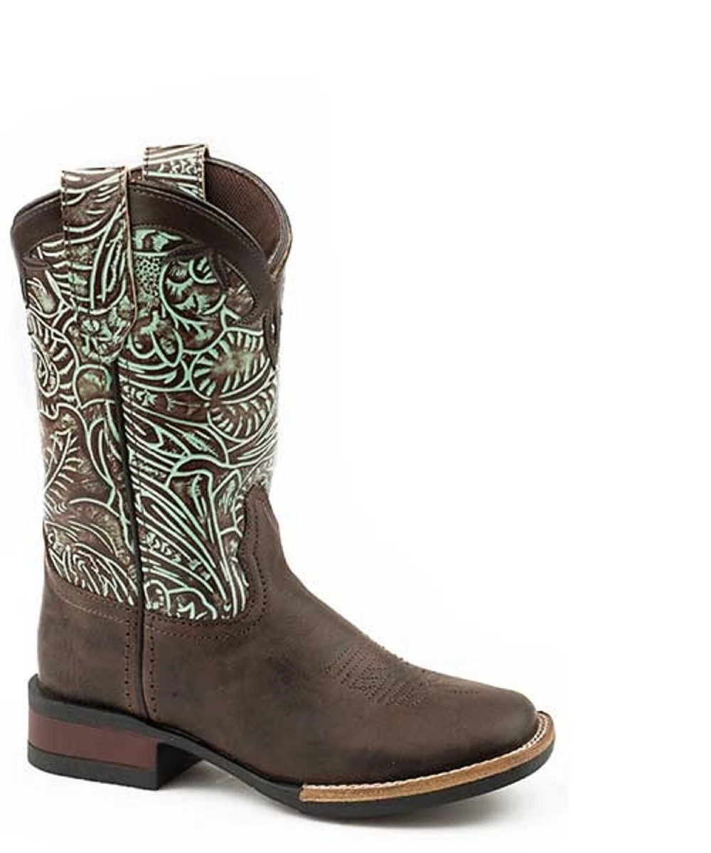 9″ Shaft; Brown Polishable Leather Vamp; Turquoise Embossed Floral Shaft Design; Padded Insole For Comfort; Square Toe; 1 1/4″ Heel; TPR Bottom with Vintage Look; Style #09-018-0912-2568
