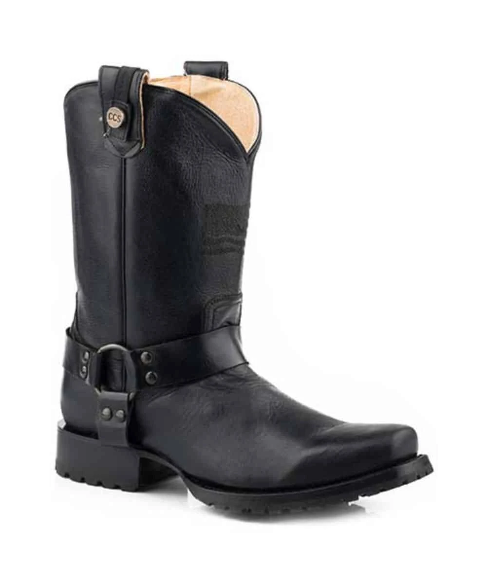 11″ Shaft; Concealed Carry System; Waxy Black Leather Vamp And Shaft; Interior Harness; Black Embroidered Flag On Shaft; All Leather Lining; Leather Walking Heel; REST Removable Insole; Single Welt; Lug Sole; Rider Pocket Rest; Biker Toe; Color: Black; Style #09-020-8352-8372
