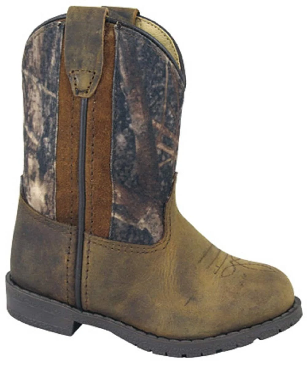 Leather; Distressed Brown Foot/True Timber Camo Shaft; Round U Toe; Low Heel; Rubber Sole; Style #3232T