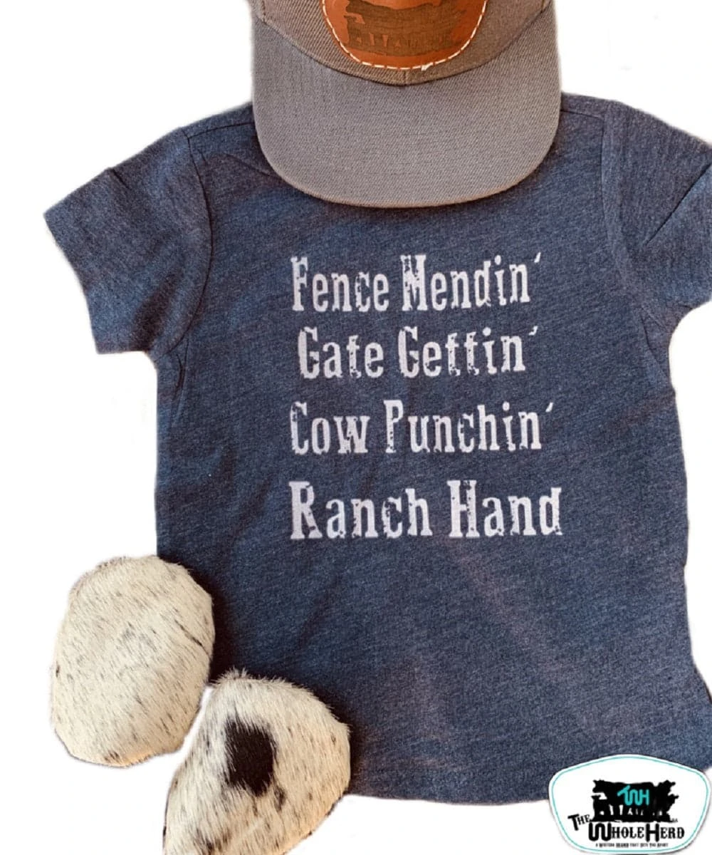 Soft Heathered Tee; Unisex Fit; Fits True To Size; Front Print Reads: Fence Mendin’, Gate Gettin’, Cow Punchin’, Ranch Hand; Style #K1311
