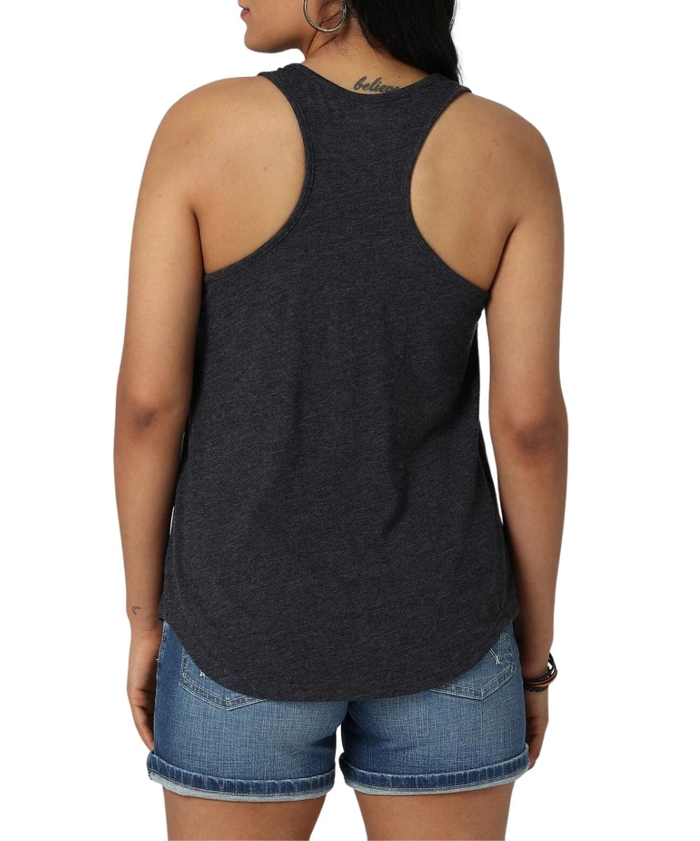 50% Cotton/50% Polyester; Regular Fit; Sleeveless Tank; Scoop Neckline; Yellow Wrangler Rope Logo Printed Across Front; Racerback Style; Color: Caviar Heather; Style #112328909