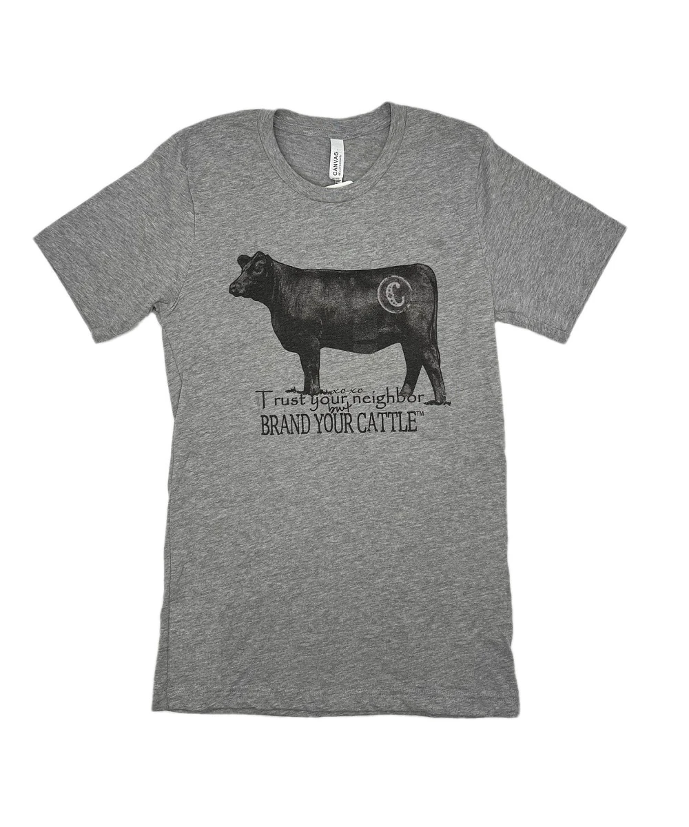 90% Cotton/10% Polyester; Crew Neck; Front Black Angus Print With Cowpokes Watermark Reads: Trust Your Neighbor But Brand Your Cattle; Color: Heather Gray; Style #BYC ANGUS TEE